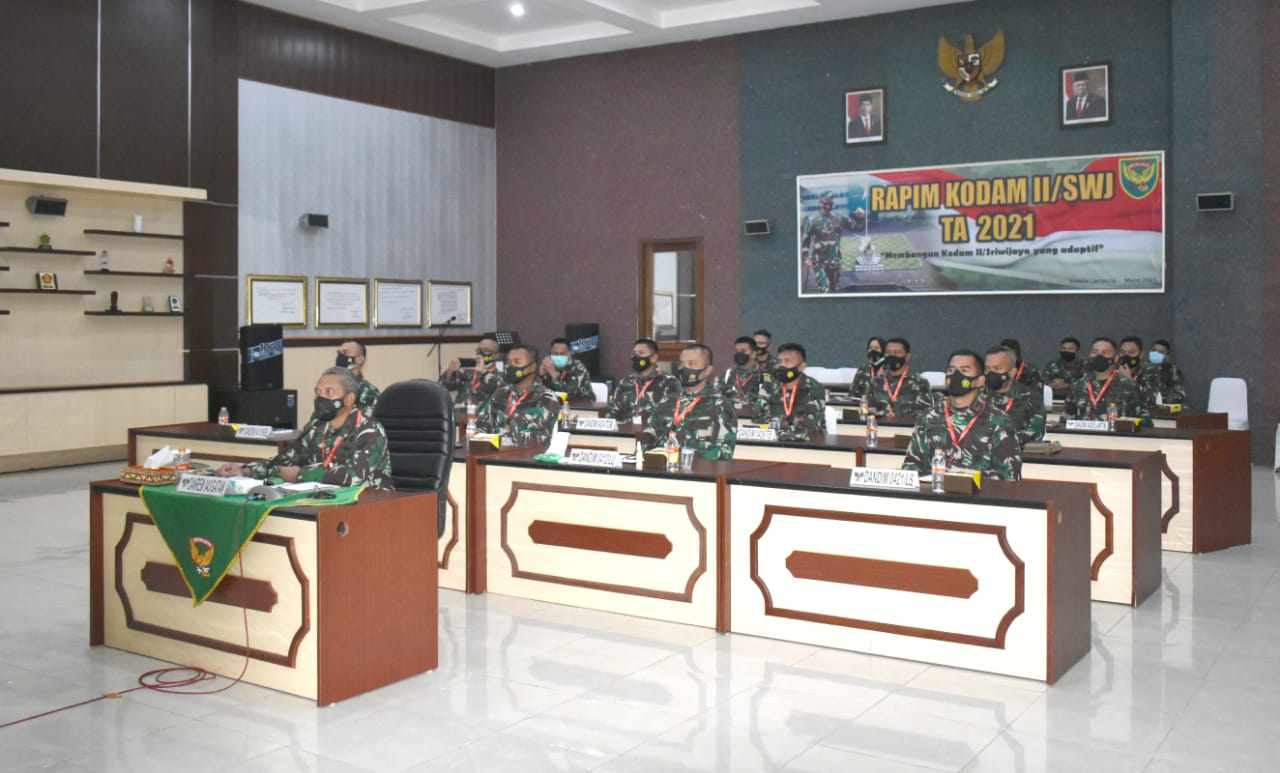 Rapat Pimpinan (Rapim) Kodam II/Swj merupakan kegiatan penting yang dilaksanakan pada awal tahun anggaran sebagai kelanjutan dari Rapim TNI AD serta merupakan bagian dari proses dalam tahapan perencanaan. Demikian halnya pada Tahun 2021 ini, untuk mengawali pelaksanaan Program dan Anggaran Kodam II/Swj TA 2021 maka Kodam II/Swj menyelenggarakan kegiatan Rapim Kodam II/Swj TA 2021.