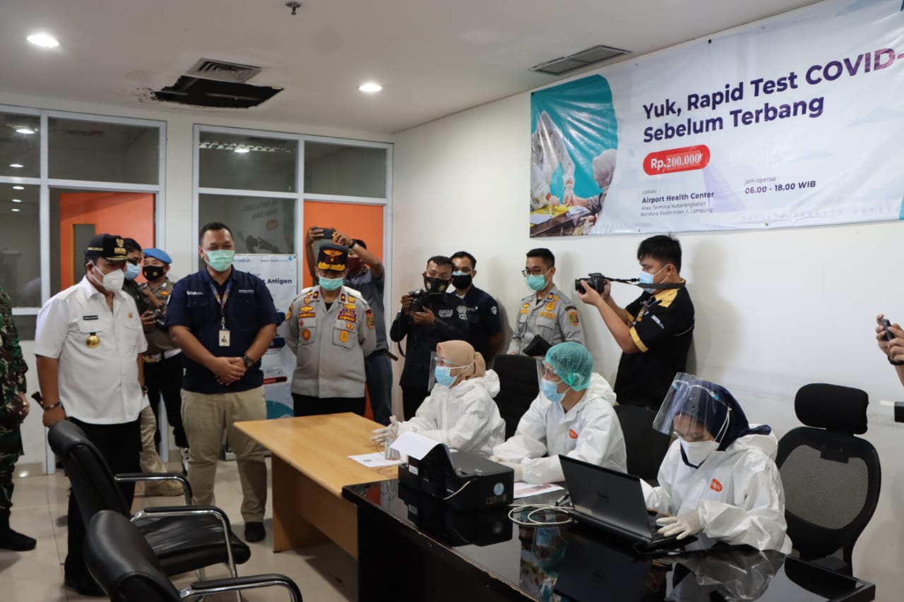 Setelah meninjau Terminal Rajabasa, Gubernur melanjutkan monitoring menuju Bandara Radin Inten II. Di Bandara, Gubernur mengecek langsung penerapan protokol kesehatan.