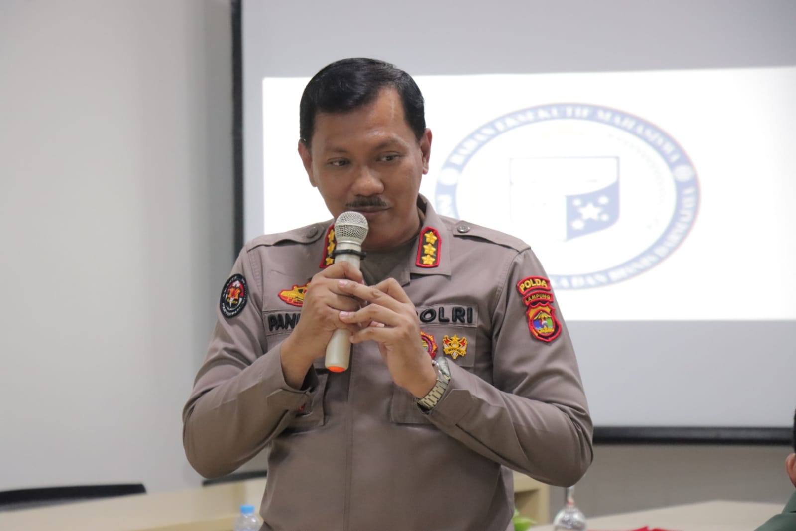 Bandar Lampung— Kabid Humas Polda Lampung Kombes Pol Zahwani Pandra Arsyad S.H.,M.Si., hadiri undangan sebagai pemateri kegiatan latihan keterampilan menajemen mahasiswa tingkat dasar oleh BEM IIB Darmajaya, yang di laksanakan di Pasca Sarjana Darmajaya Lampung, Kamis (5/1/2023).