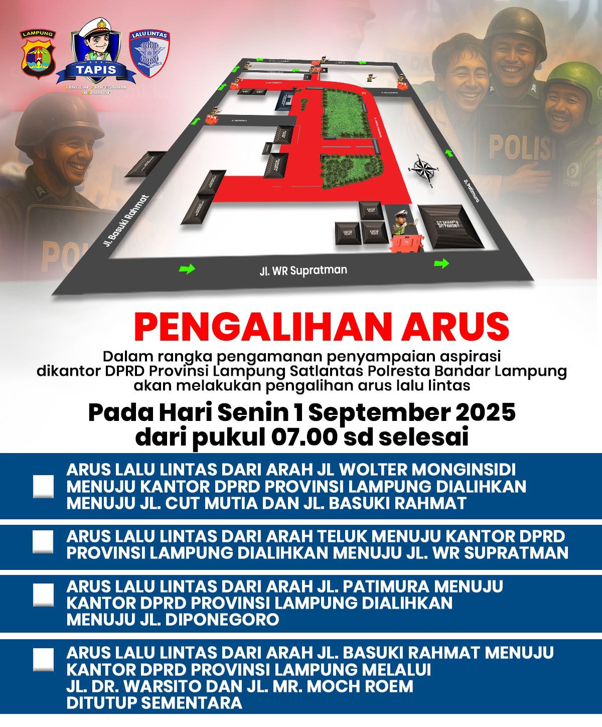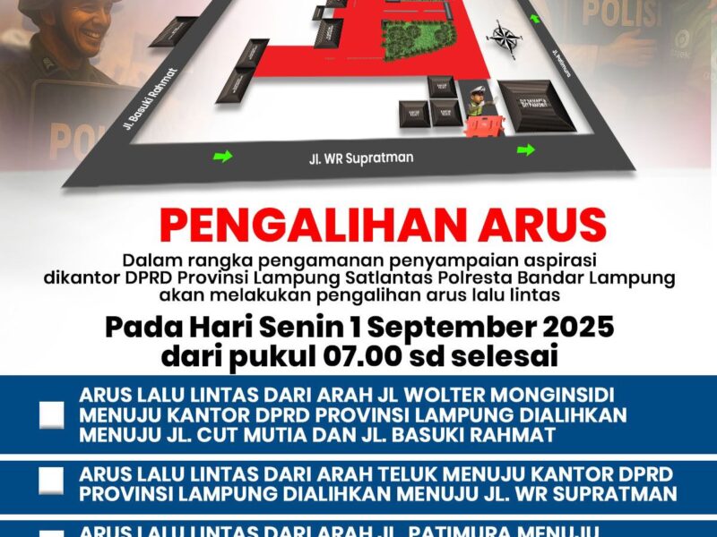 Lampung – Satuan Lalu Lintas (Satlantas) Polresta Bandar Lampung akan memberlakukan pengalihan arus lalu lintas pada Senin (1/9/2025) mulai pukul 07.00 WIB hingga selesai. Langkah ini dilakukan untuk mendukung kelancaran dan keamanan penyampaian aspirasi di Kantor DPRD Provinsi Lampung.